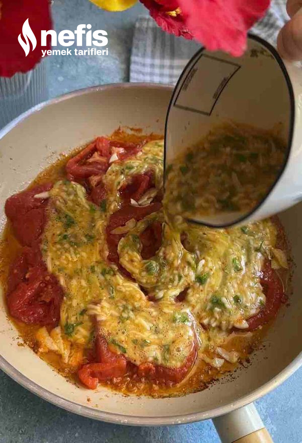 - Domatesler güzelce suyunu çekip yağına kalınca yumurtalı karışımını domateslerin üzerine dökelim.