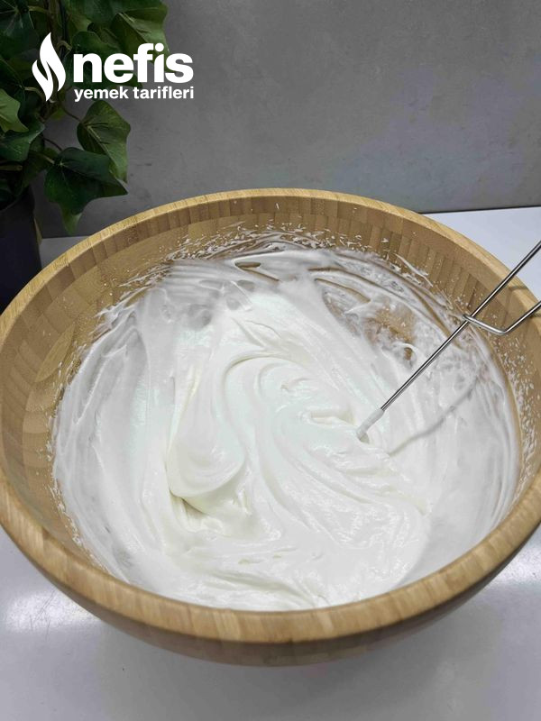 - Paketin içindeki ikili krem şantiyi 1 su bardağı soğuk süt ile karıştırıp tel veye mikserle koyulaşa kadar çırpalım.
