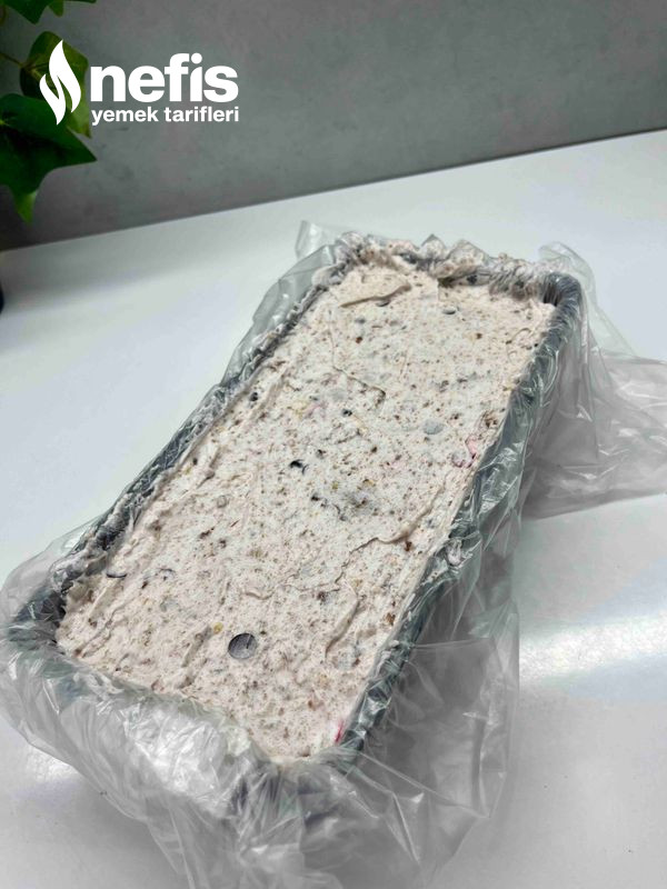 - Dikdörtgen kek kalıba streç serip üzerine harcı döküp spatulayla düzeltelim ve buzlukta bir kaç saat bekletelim.