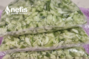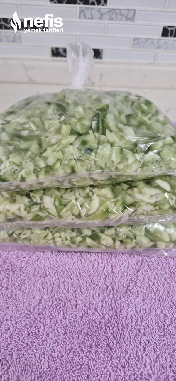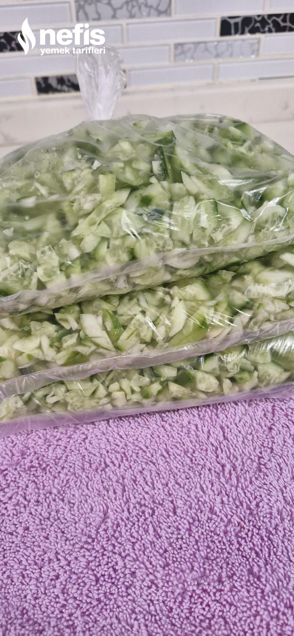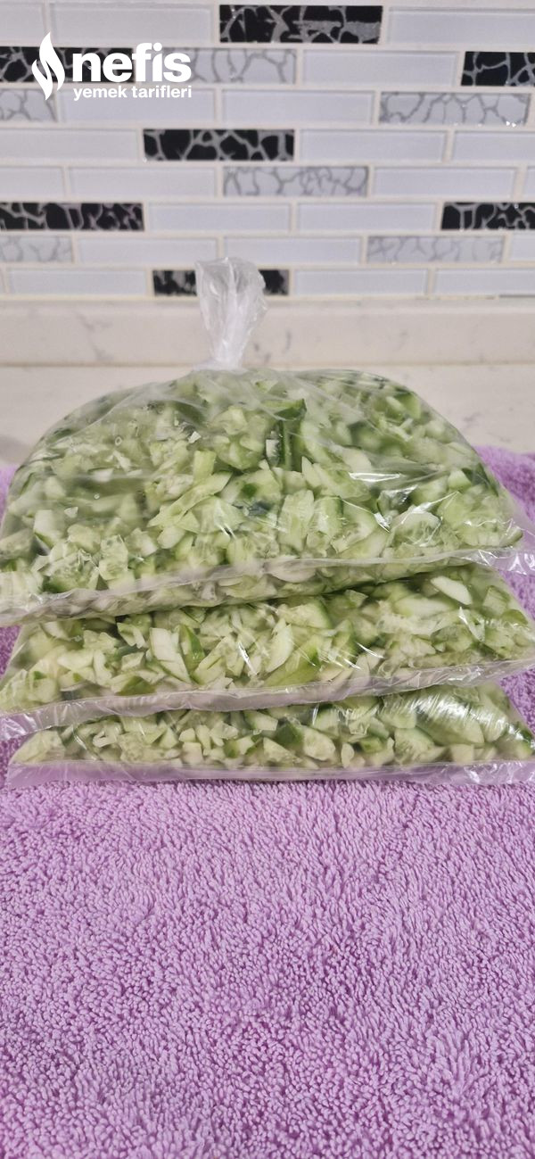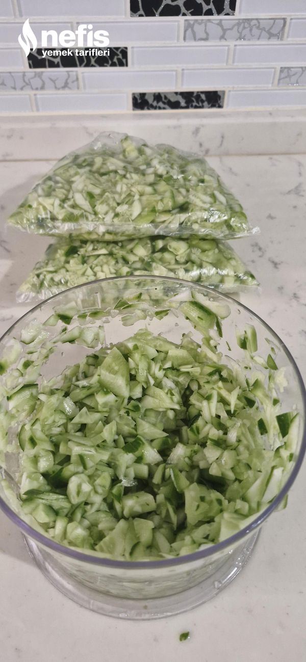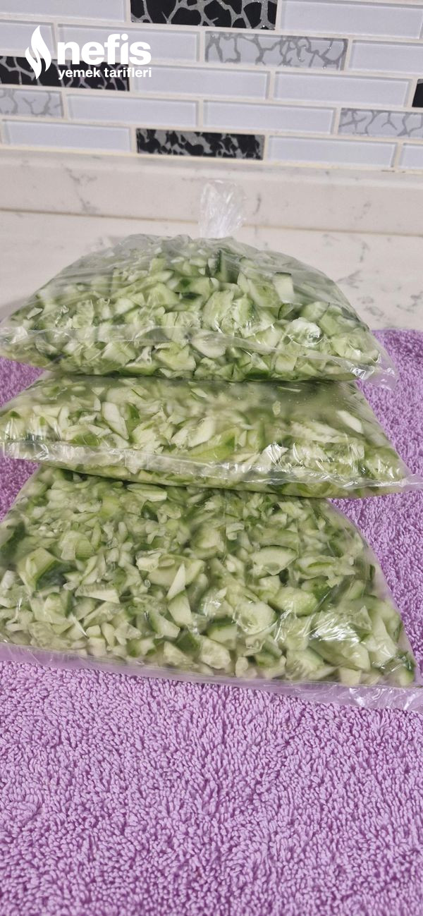 3. Cacıklı salatalıkları dondurucuya konulur ,kışın yapacağımız vakit yoğurdun içine direk buzu salatalık konulur ,isteyen içine sarımsak rendesi ve üzerine nane serpip servise hazır.