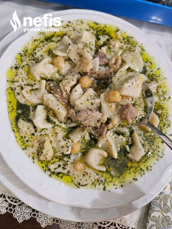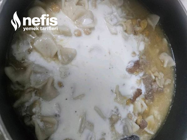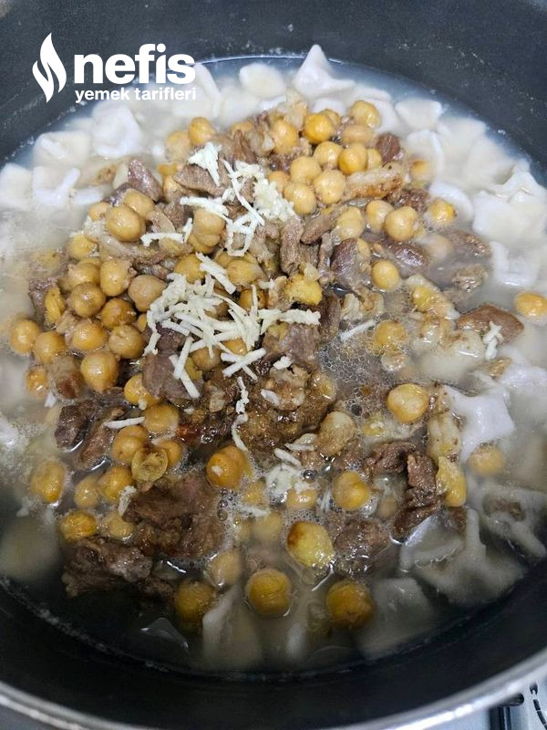 - Hazır olan mantıya et, nohut, sarımsak eklenip karıştırılır 5 dk pişirilir.