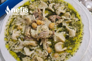 - Hazır olan mantıya et, nohut, sarımsak eklenip karıştırılır 5 dk pişirilir.