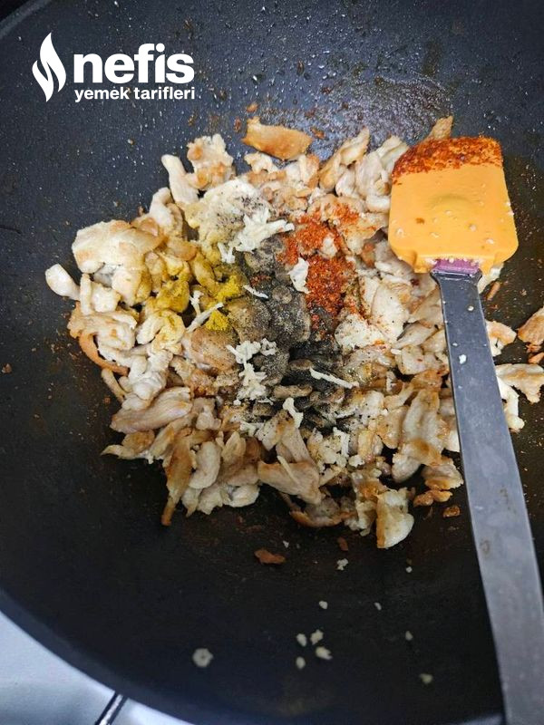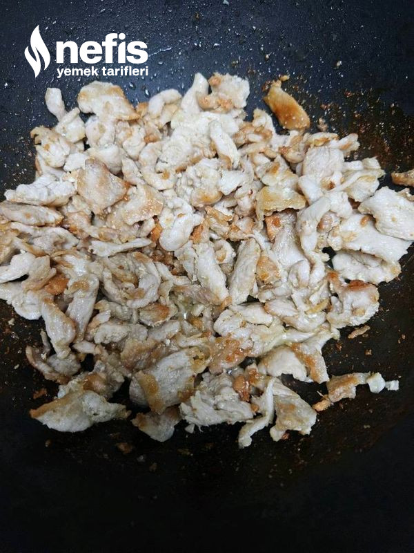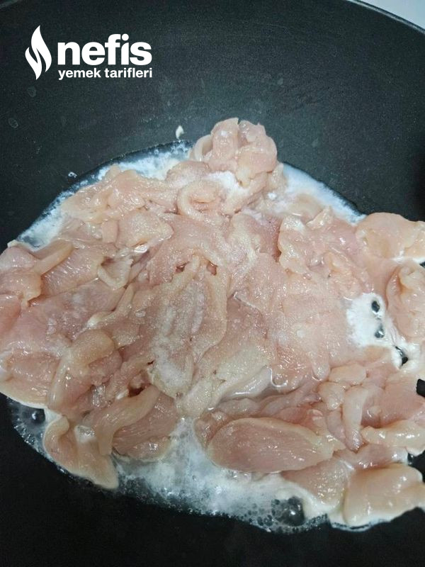 - Tavuk göğsü ince ince kesilir tuz ile bir arada uygun bir tavaya alınarak bir bardak su ile ocağa bırakılır.