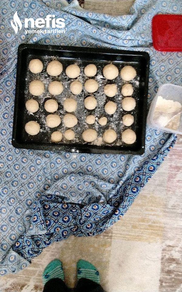 - Hamurdan mandalina büyüklüğünde bezeler yapın ortasına una batırılmış oklava ile yuvarlak açın kızgın yağda altını ve üstünü kızartın.