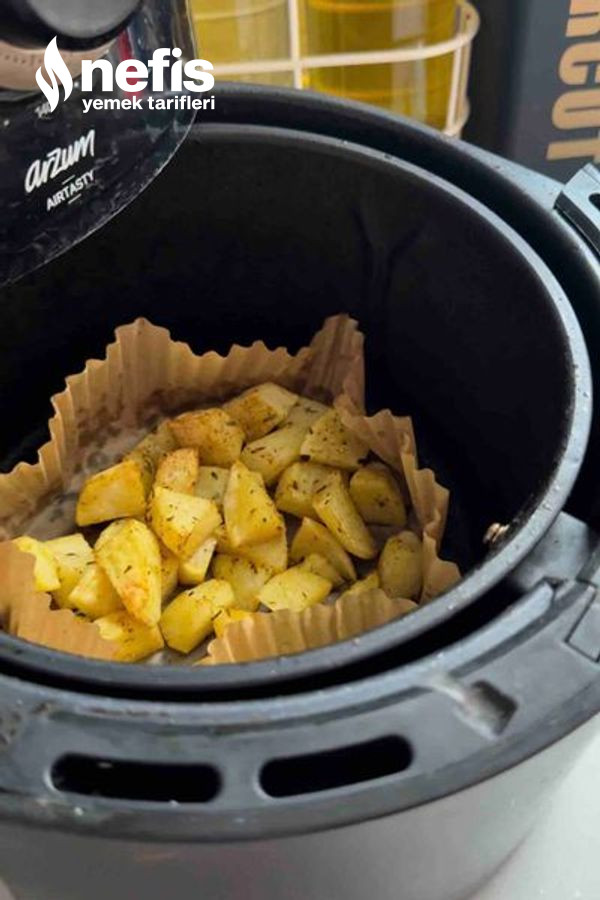 - Patatesimizi büyük küpler halinde doğrayıp hafif kajun baharatıyla airfryerda 15dk kızartıyoruz.