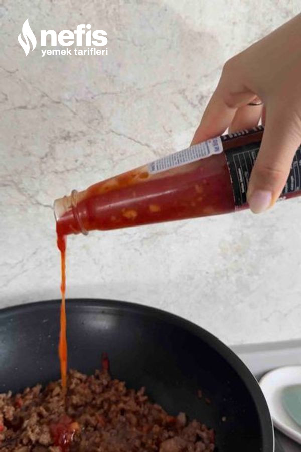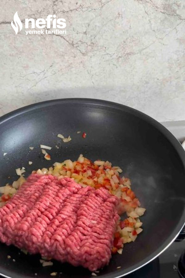 - Soğan ve kapya biberi küp küp doğrayıp yağda öldürdükten sonra kıyma ve salçayı ekleyip kavuruyoruz.