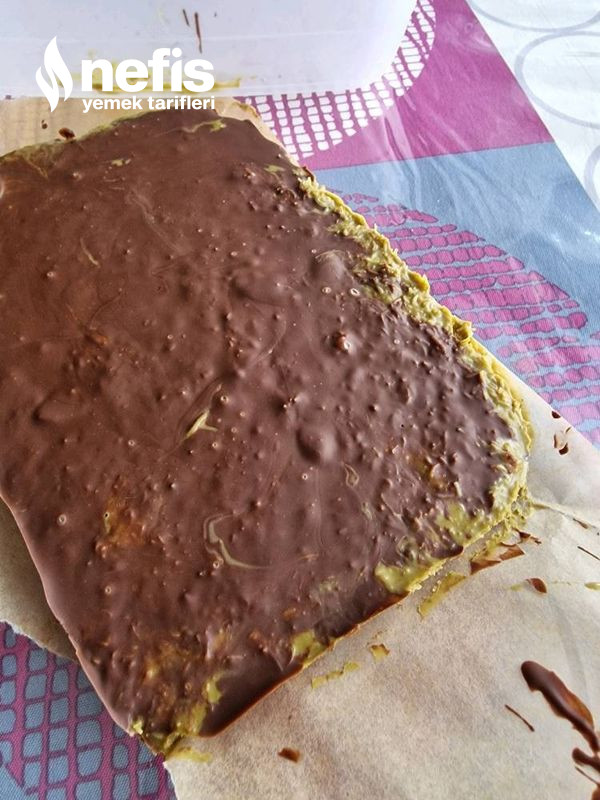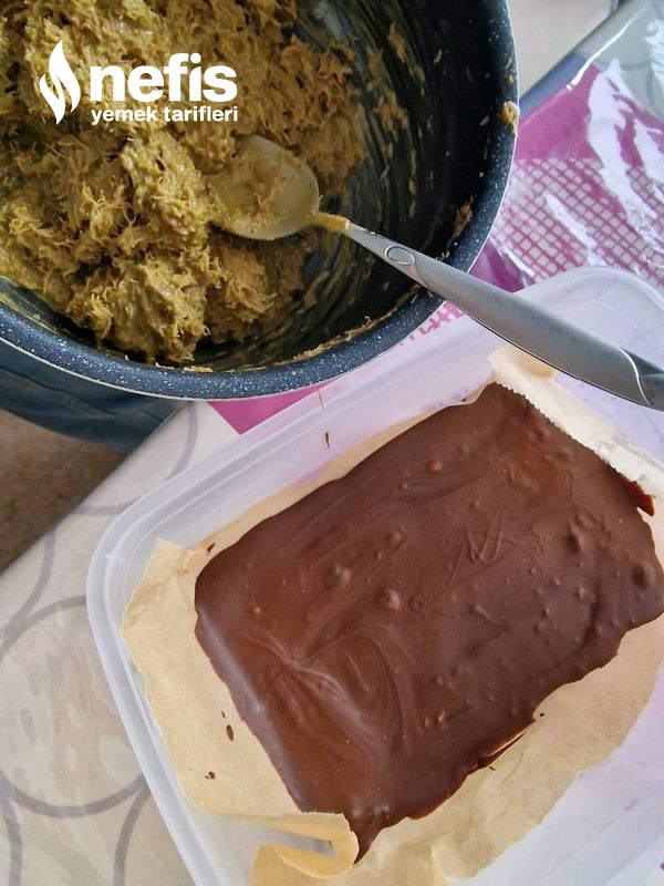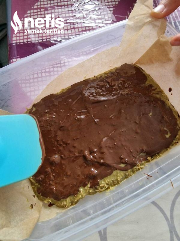 4. Çikolata donduktan sonra fıstıklı kremayı ekleyip kaşıkla düzeltin.