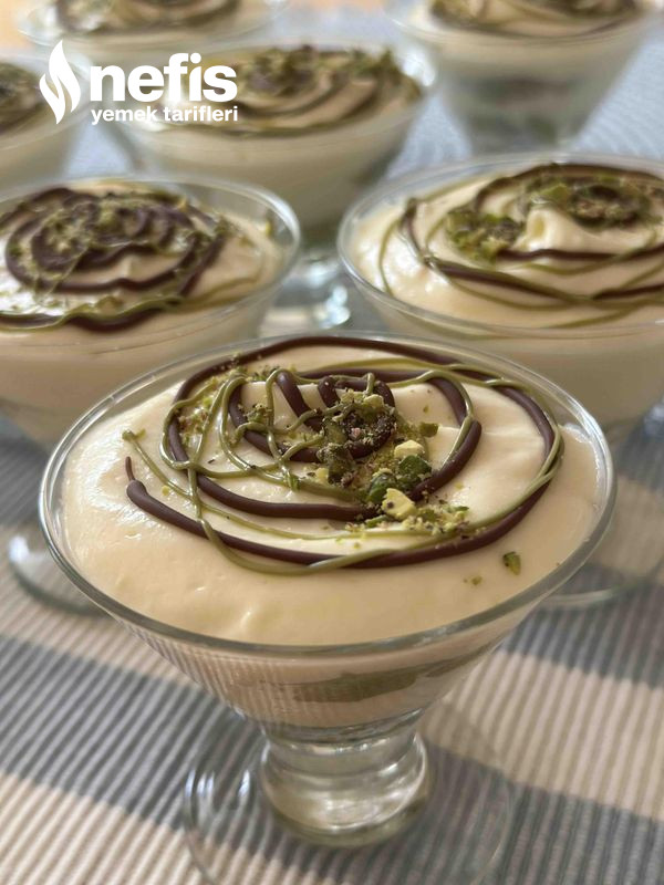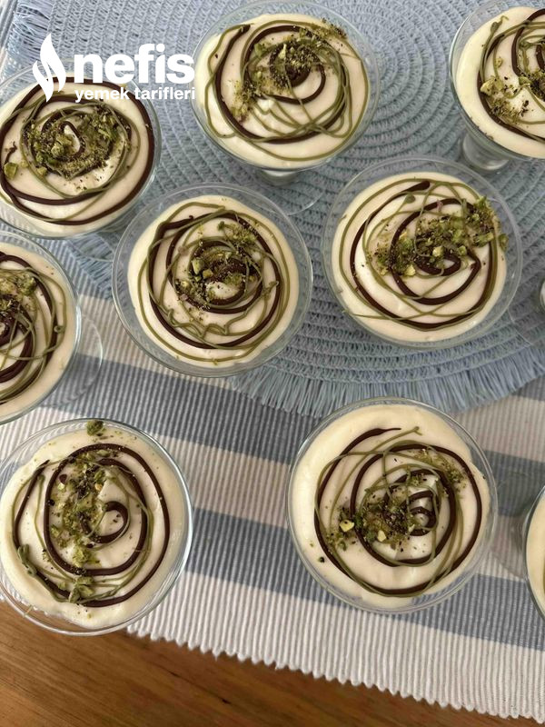 11. Servis: çikolatayı ve fıstıklı kremayı başka kaplarda mikrodalgada yahut benmari adabı eritin. Eriyen çikolatayı ve fıstıklı kremayı üzerine dökün. Üstüne dövülmüş fıstık serpin, çıtır bir doku ve renk katmak için.