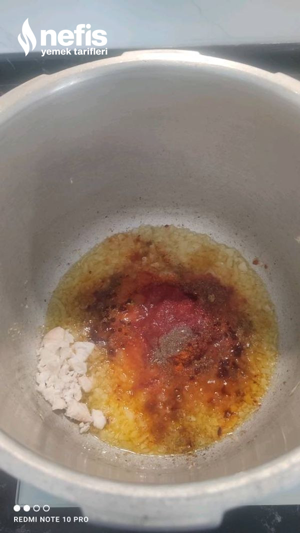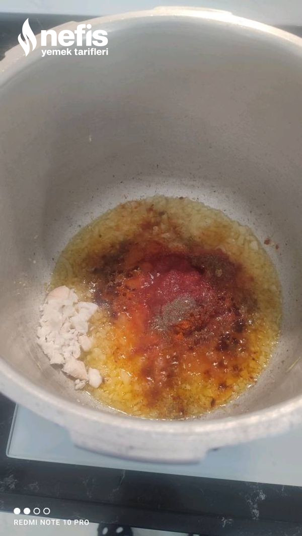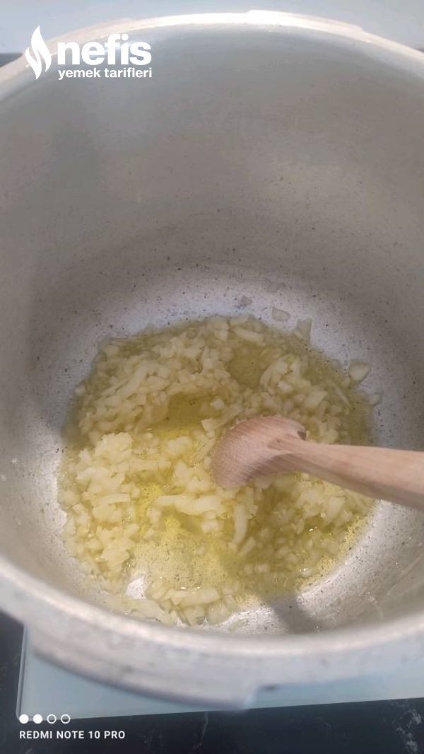 - Öncelikle ince ince kıydığımız soğanları ve sarımsağı düdüklüye alalım.