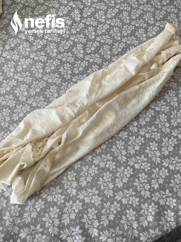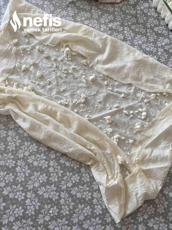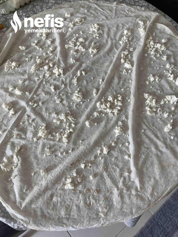 - Yufkayı biraz sıvı yağ ile yağlayıp, lor peyniri yayalım.