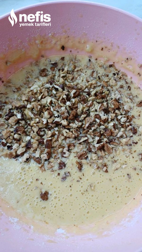 - Vanilya ,un ve kabartma tozunu ekleyip çırpalım sonrasında cevizi ekleyelim sade olarak kullanacağımız kekimizi borcama dökelim.