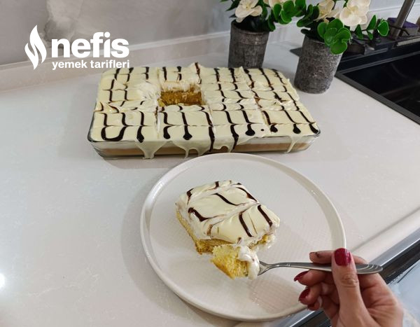 8. Tamamen soğuyan kekimizin üzerine bir buçuk su bardağı kadar süt ve 2 yemek kaşığı kadar şekeri güzelce karıştırıp üzerine dökelim çabucak sosu çekecektir.