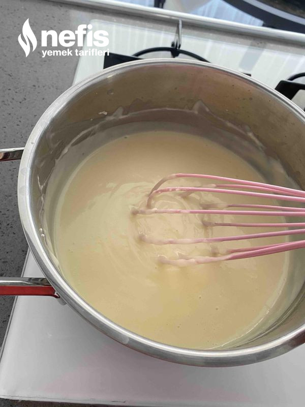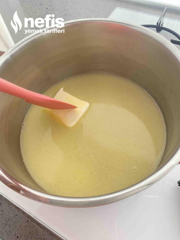 - Bir tencereye vanilya ve tereyağı hariç tüm materyalleri koyup tel çırpıcıyla karıştırarak kremayı pişirin.