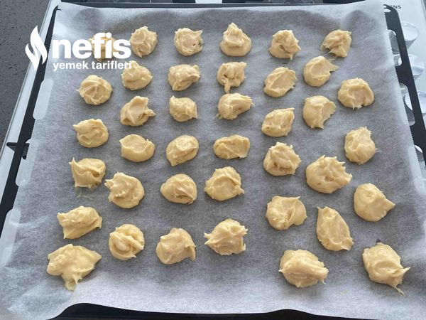 - Hamur hazırladıktan sonra tatlı kaşıkları yardımıyla yağlı kağıt serili fırın tepsisine aralıklı dizin. (1 er tatlı kaşığı kâfi oluyor).