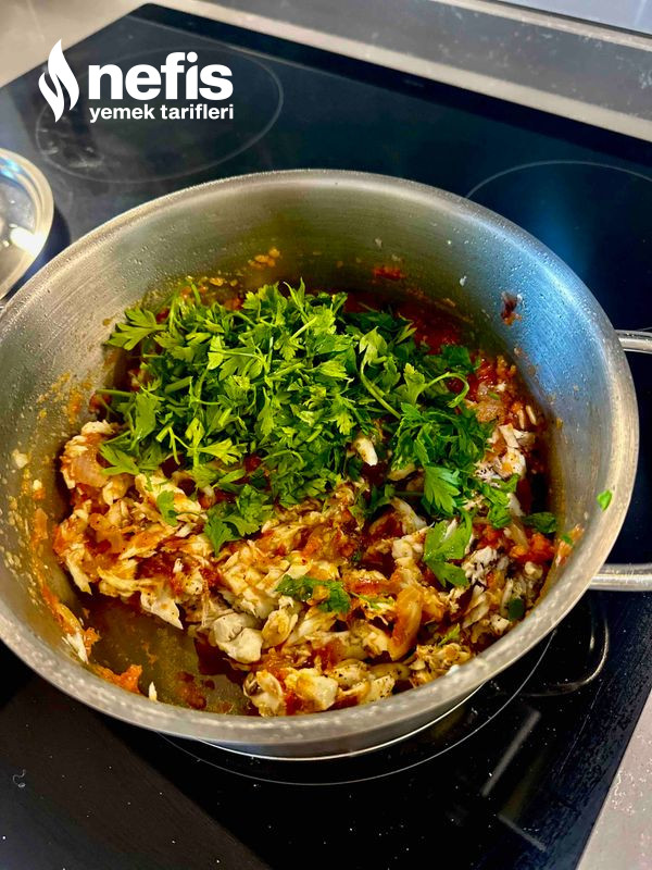 5. Rendelenmiş domateslerimizi, tuz, kimyon, şeker ve tatlı toz biberi de ekleyerek 5 dakika pişiriyoruz ve sonrasında bir avuç maydanoz ekliyoruz.