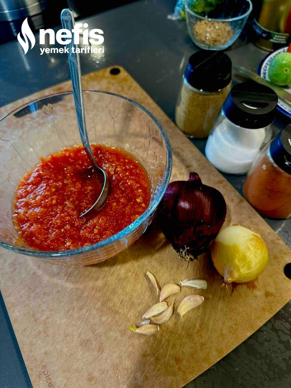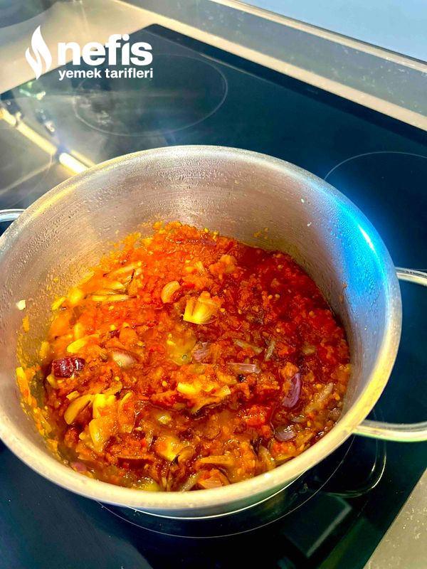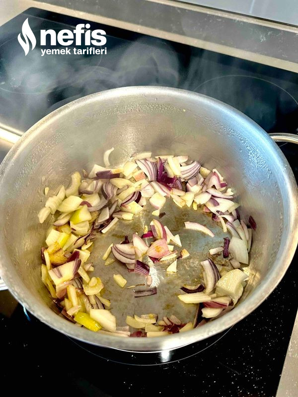 4. Soğan ve sarımsağımızı sotelik doğruyor ve zeytinyağında kavuruyoruz.