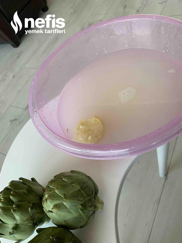 2. Karbonatlı su yapıp enginarları ve kestiğimiz saplarını da bu suya ıslayıp yarım saat bekletelim. Sonra çokça durulayalım. Dilerseniz saplarını soyup yemeğe ekleyebilirsiniz ben çiğ olarak yemeyi tercih ediyorum.