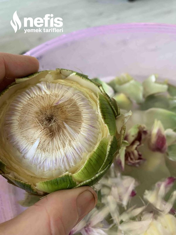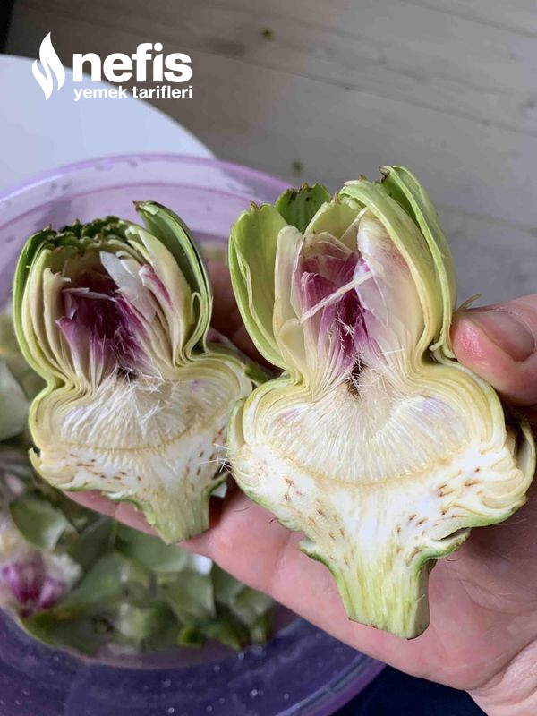 4. Yapraklarını yeterlice açıp merkezindeki tüylerini kaşıkla temizleyelim, olmazsa enginarları ikiye bölerek de temizleyebilirsiniz. Benim enginarlar çok küçüktü kesmek zorunda kaldım.