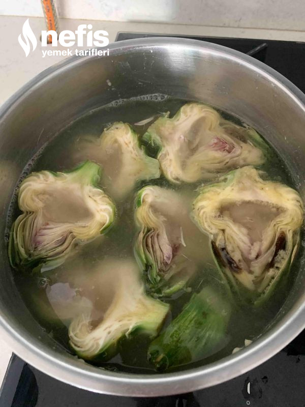 6. Yarım limon suyunu enginarların üzerine dökelim. Üzerini kapatacak kadar su koyalım, ağzını kapatıp 45 dakika pişirelim.