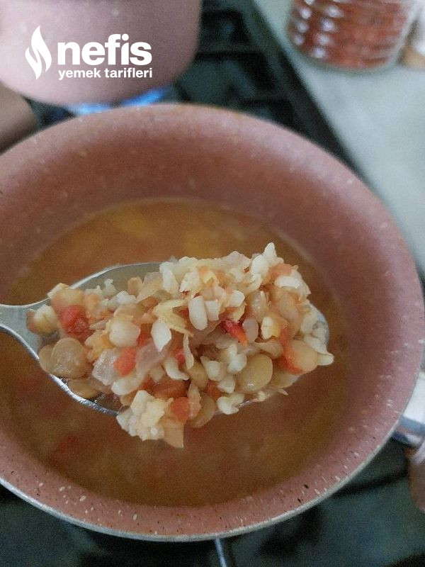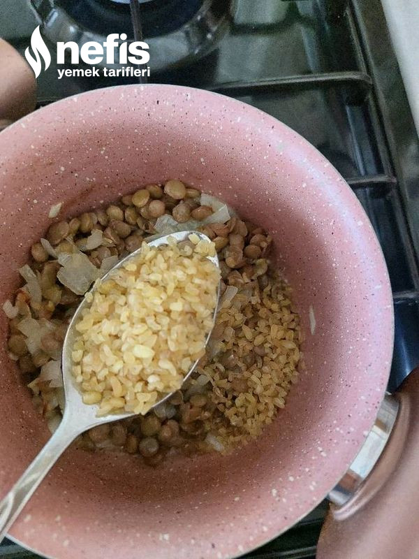 3. Ardından bulguru ve mercimeği ekleyip suyunu dökelim bulgur pişene kadar pişirelim. 🌼