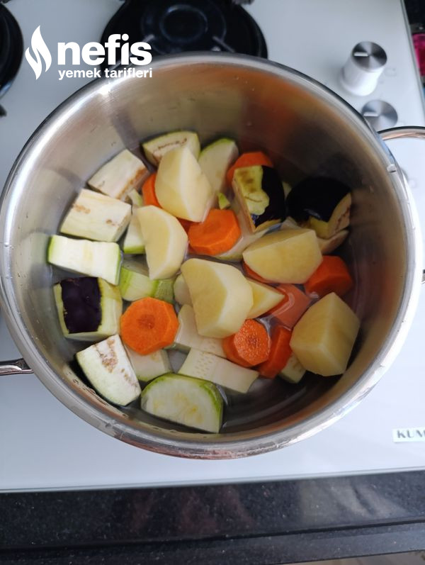 - Tencereye 2 su bardağı soğuk su ekleyin ve zerzevatları koyup haşlayın.