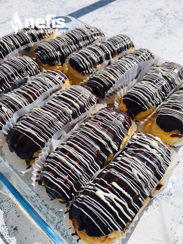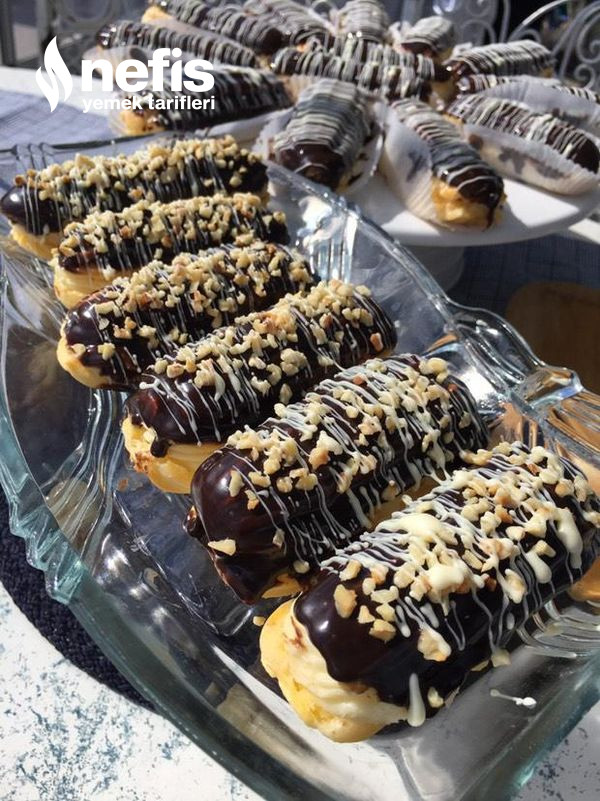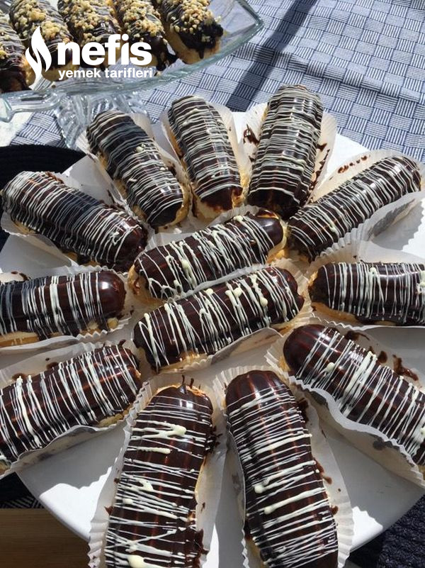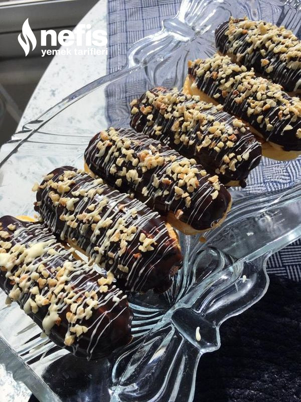 - Ekleri ortadan ikiye keserek içlerine kremayı sıkın üzerlerini benmari tarzı eritip hazırlamış olduğunuz çikolataya batırın.