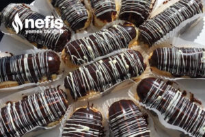 - Ekleri ortadan ikiye keserek içlerine kremayı sıkın üzerlerini benmari tarzı eritip hazırlamış olduğunuz çikolataya batırın.