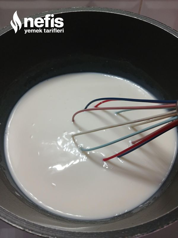 - Tatlımızın kreması için küçük bir tencereye süt, un, nişasta ve toz şekeri alıp güzelce çırpma teli ile karıştıralım.