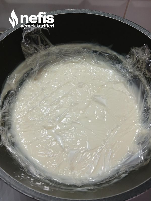 - Oda sıcaklığına gelene kadar karıştıralım ki üzeri kabuk tutmasın. Oda sıcaklığına geldikten sonra üzerini streç sinema ile örtüp 1 saat buzdolabına kaldıralım. Buzdolabında beklerken daha katı bir kıvam alacaktır.