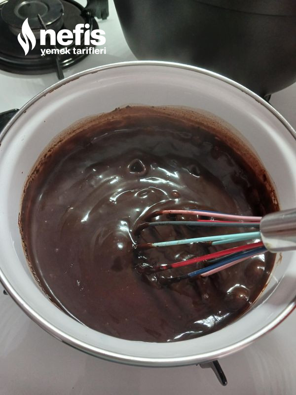 - Çikolata sosunu pakette yazan süt ölçüsünden 1 bardak eksik süt ile pişirelim.