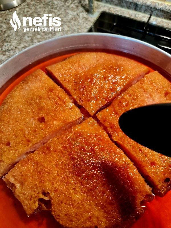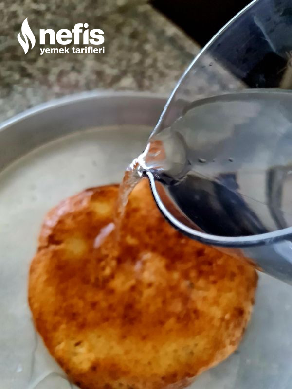 - Islatılan kadayıfı fazla suyu alınır. Kadayıf geniş bir tepsiye alınır. Üzerine kaynayan şerbet dökülüp orta ateşte 45 dakika pişirilir.