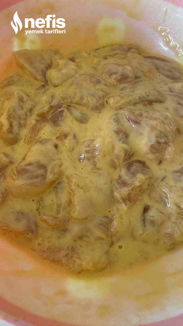 - Tavuk göğüsü iri iri kesin. Pane için, bir kapta bütün gereçleri ekleyip karıştırın. İçine tavuğu ekleyin uygunca karıştırın.