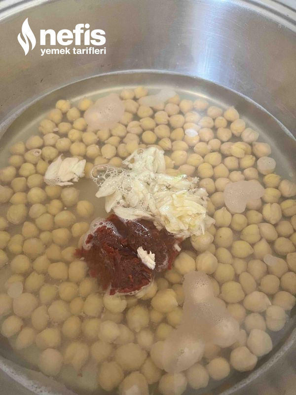- Tencereye nohut ve salçayı alalım, üzerine 3 su bardağı su ekleyip kaynamaya bırakalım. Kaynayan suya bir limon suyu ve sarımsağı ezip, ek edelim bir taşım daha kaynatalım.