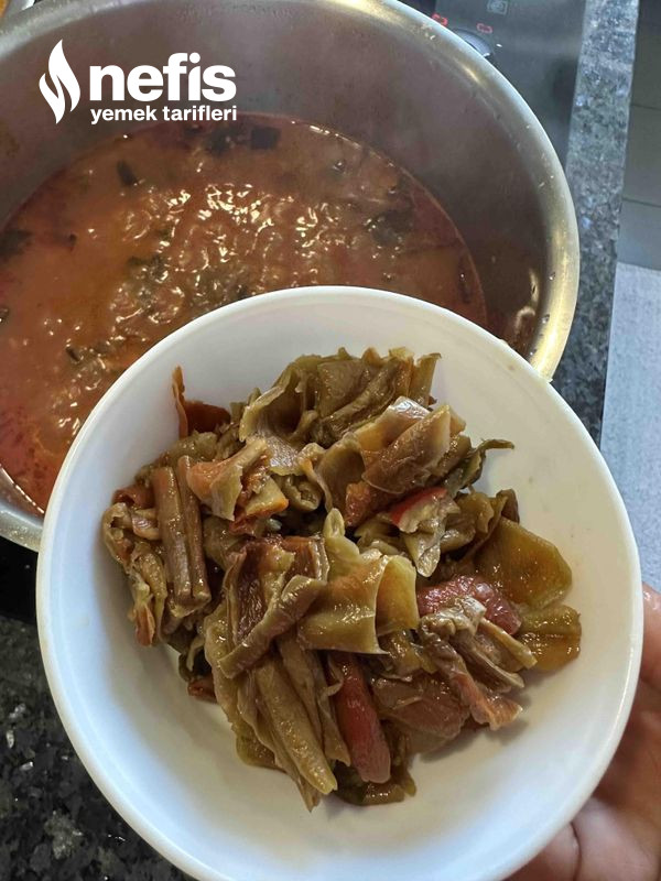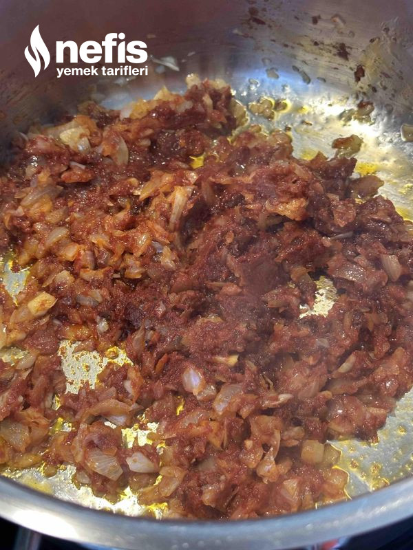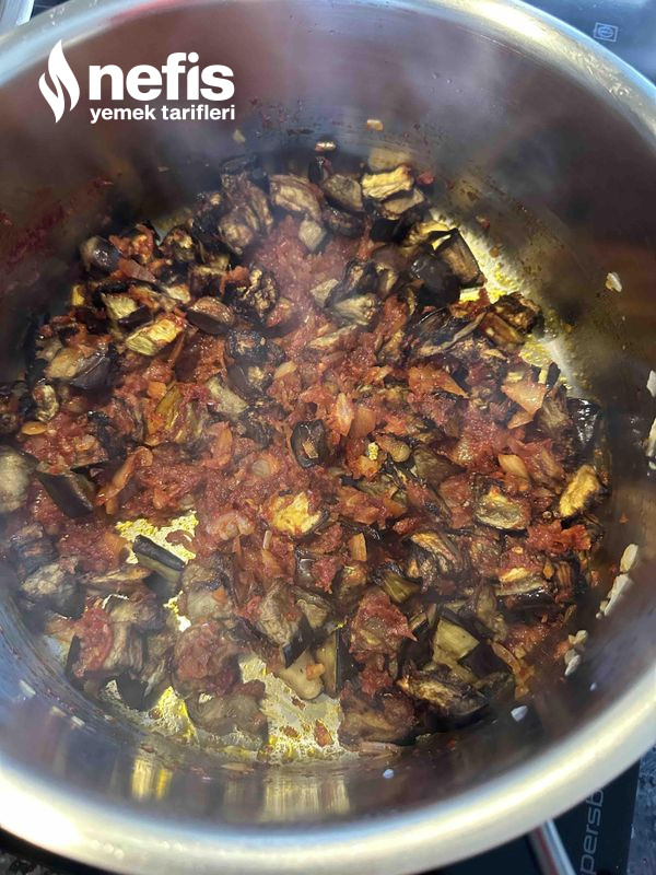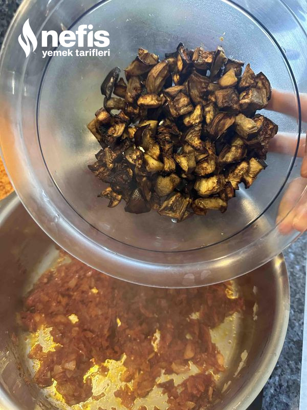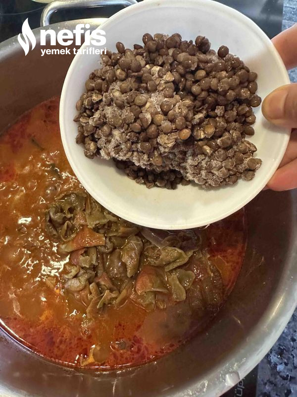 - Kuru zerzevatları (önceden haşlanmışsa daha iyi) ve baharatları ekleyin. Ben evvelden haşladığım kuru biberleri ve patlıcanları sıcak hava fritözünde hafif kızartıp ekledim.