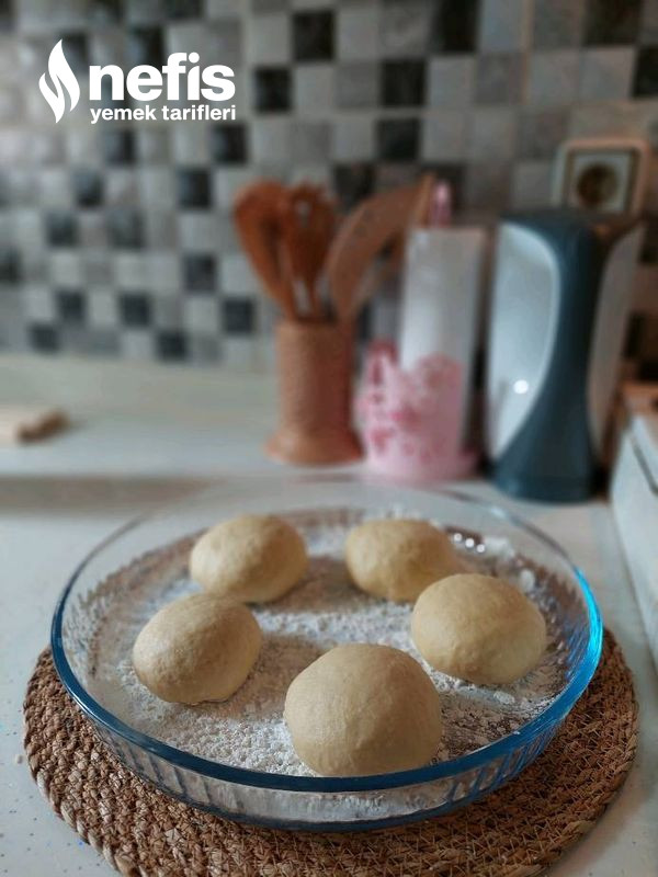 3. Hamur için; tüm materyalleri yoğurma kasesine alıp, ele yapışmayan ne sert nede çok yumuşak olmayacak biçimde bir hamur yoğuruyoruz daha sonra hamuru eşit 5 modüle ayırıp, bir tepside tabanına nişasta serperek 1 saat kadar dinlendiriyoruz.