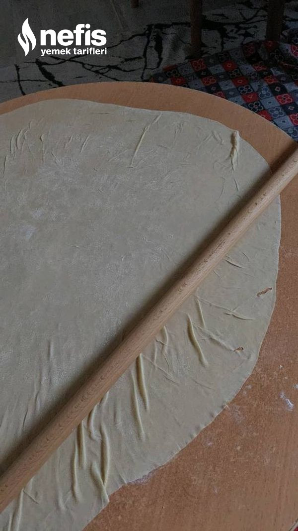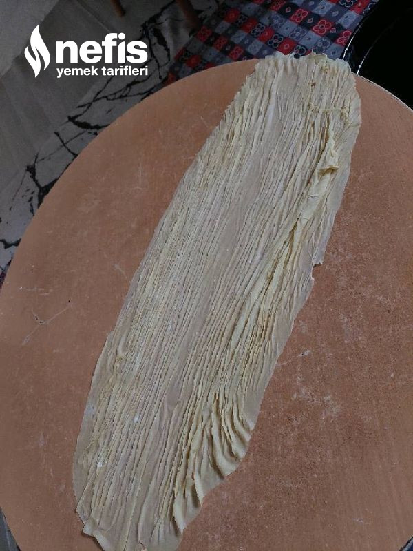 4. Dinlenen hamuru nişasta yardımıyla açıp oklava üzerine sıkıştırarak kırışık bir yufka haline getiriyoruz daha sonra ortasına krema ve cevizi koyarak yanlardan sıkıyoruz.