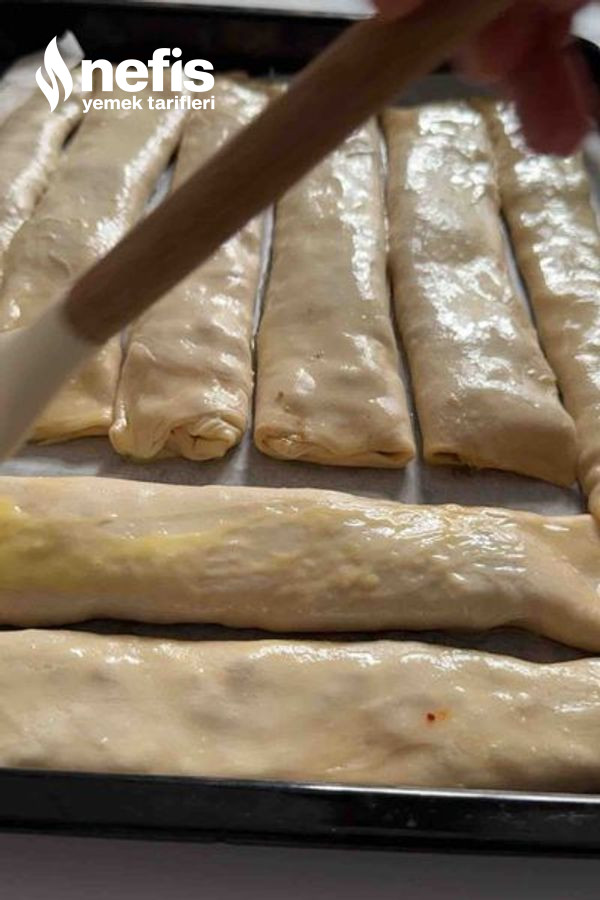 - Buzluktan yufkaları çıkarıp merdane yardımıyla açalım ucuna kıymalı harçtan koyup, iki kere katlayalım yağlı kağıt serili fırın tepsisine dizelim üzerine yumurta sarısı sürelim.