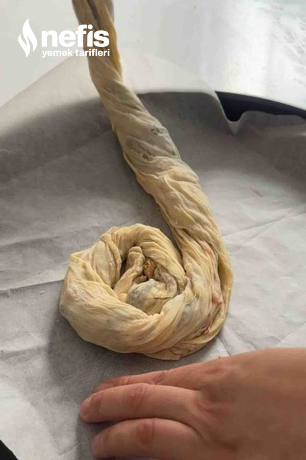 - Elinle düzeltin, içine iç harcını koyun, çevirerek katla yufkayı ve en son kıvırarak tepsinin ortasına yerleştirin.