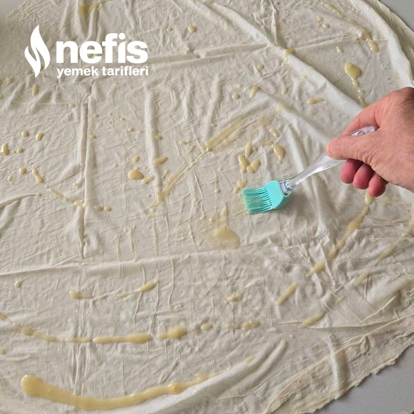 7. Bir yufkayı tezgaha alın. Sostan her tarafına eşit formda sürün.