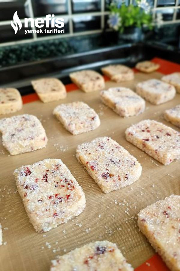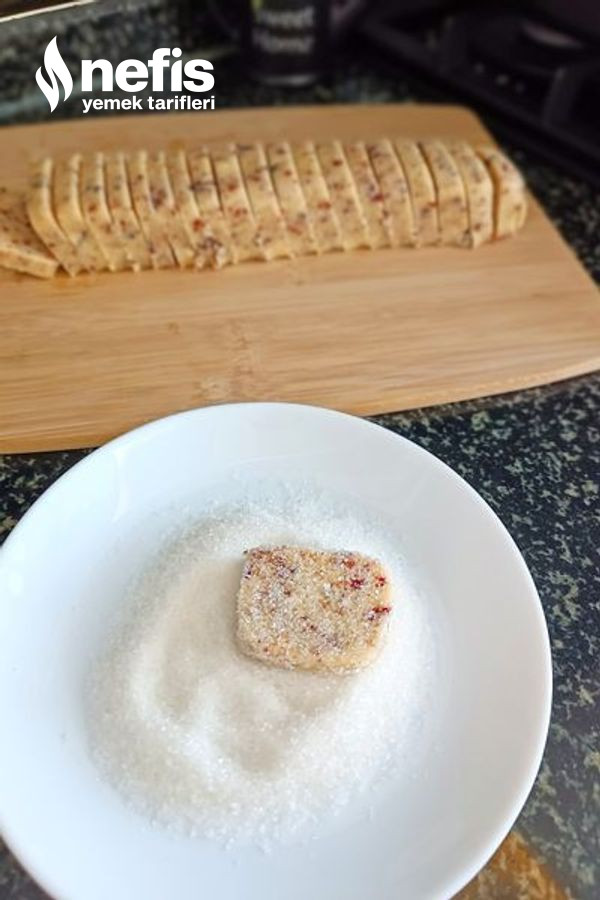 - En az iki saat buzlukta dinlendirdiğimiz hamuru dilimleyip şekere bulayalım ve yağlı kağıt serili tepsiye dizelim.