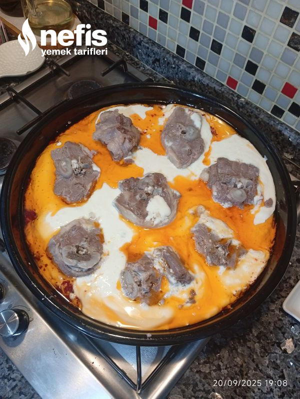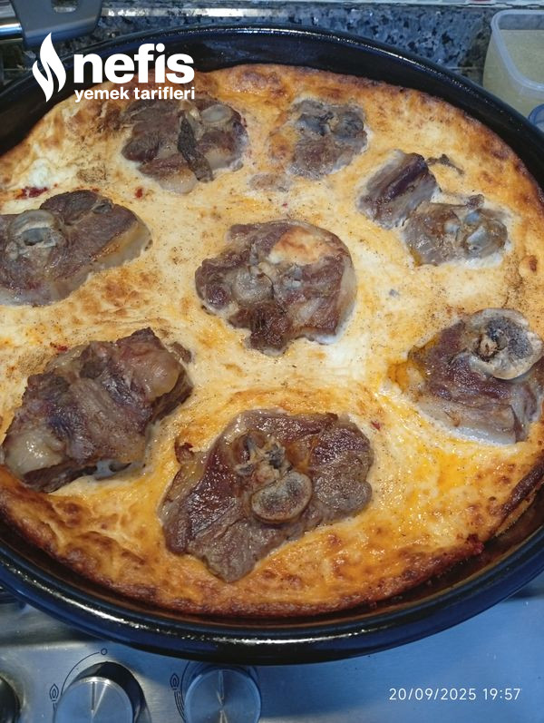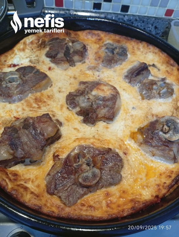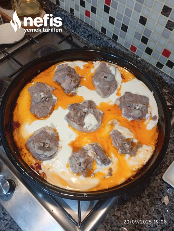 5. Haşlanan etlerinde üzerine sıralayıp, evvelden açtığımız fırında yaklaşık 180-200 derecede üzeri güzelce kızarıp yoğurtlu karışım hafif kendini çekene kadar kızartalım.