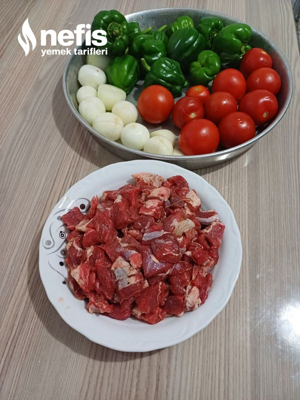1. Arpacık soğanlarımızı soyup, ortasını artı halinde kesikler yapıyoruz hoş pişmesi için. Domates ve biberlerimizi 4 kesim yapıyoruz.