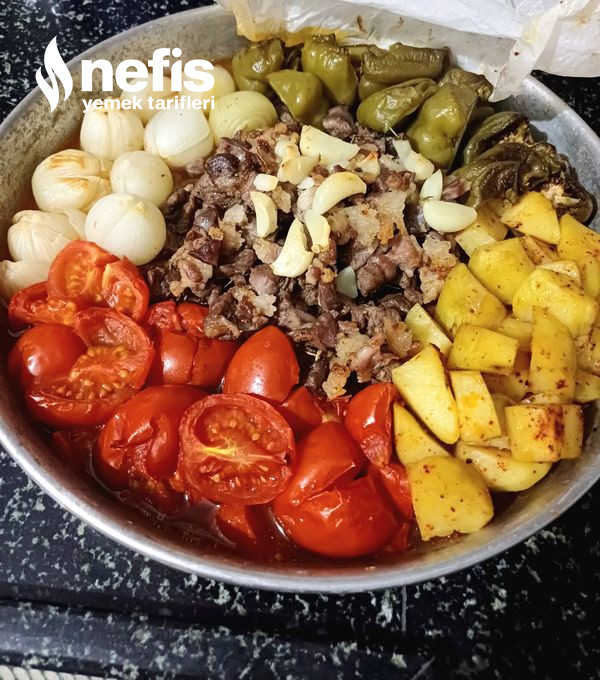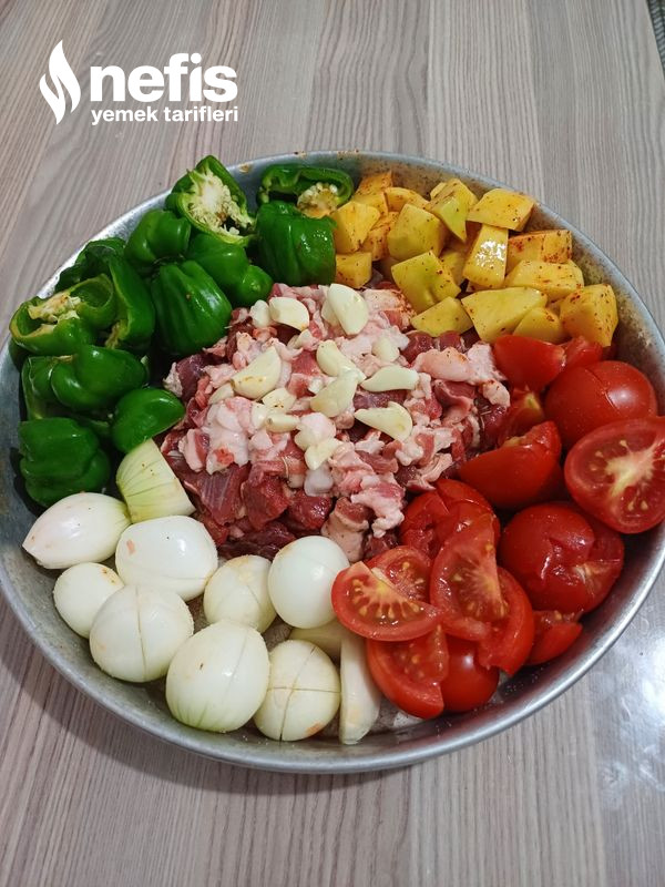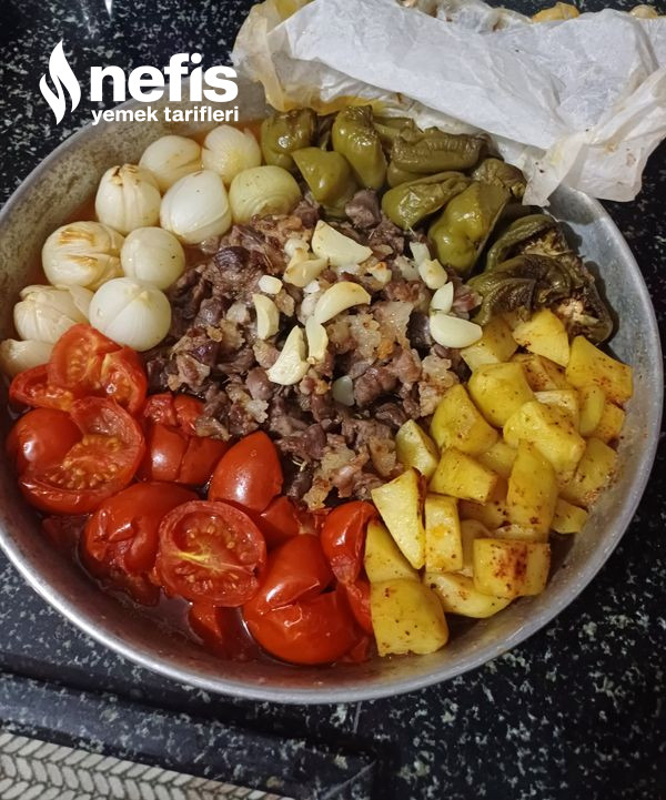 4. Önce etlerimizi tepsinin orta kısmına koyuyoruz daha sonra etrafına sebzelerini koyuyoruz.