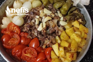 4. Önce etlerimizi tepsinin orta kısmına koyuyoruz daha sonra etrafına sebzelerini koyuyoruz.