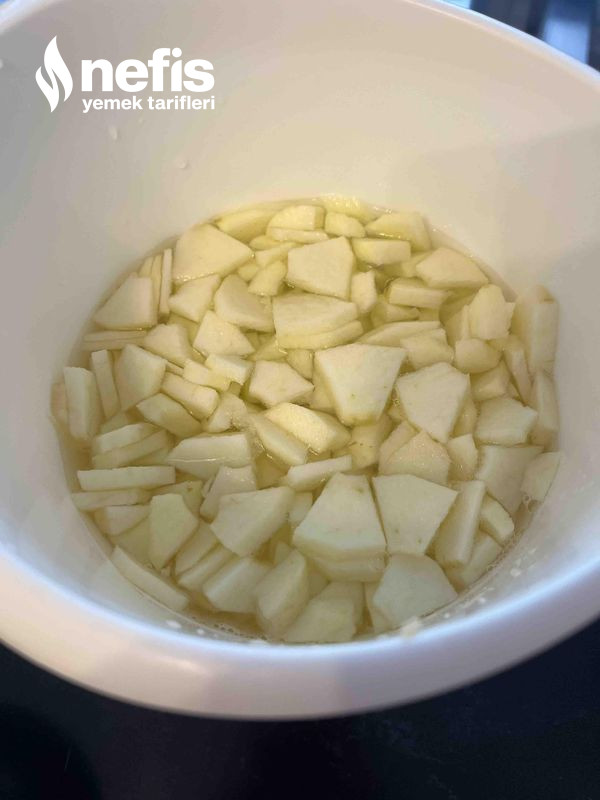 - Elmaların kabuklarını soyup küçük dilimlere keselim, kestiklerimizi kararmasın diye hazırlanan limonlusuya ek edin.