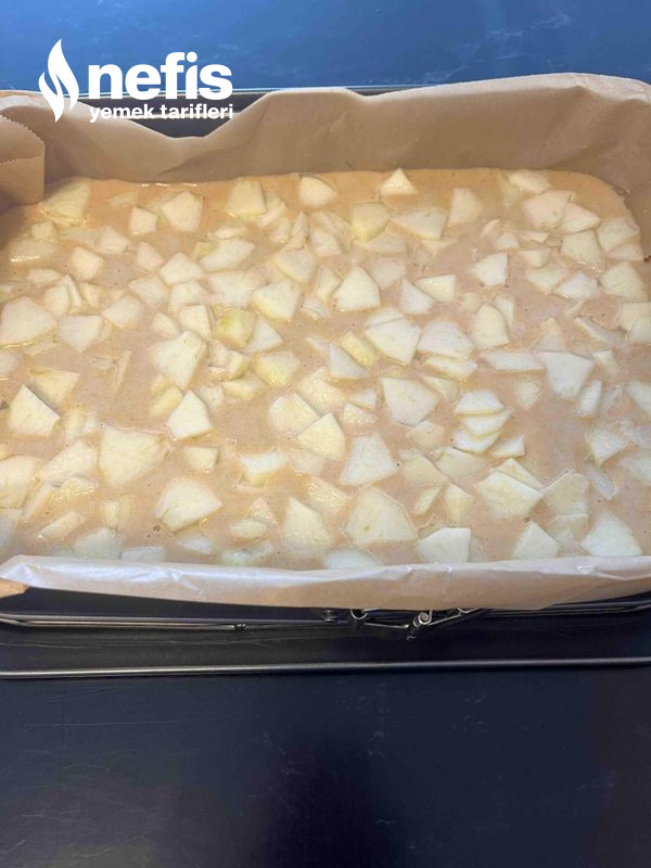 - Elmaları süzün, kek harçın üzerine dağıtın, elinizle hafif elmaları kekin içine bastırın.