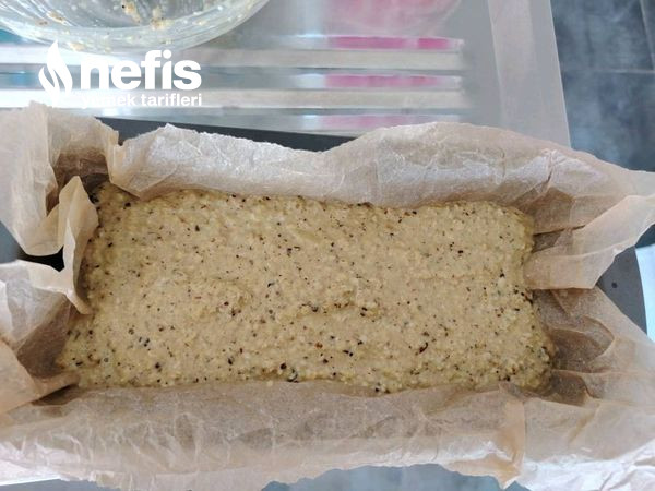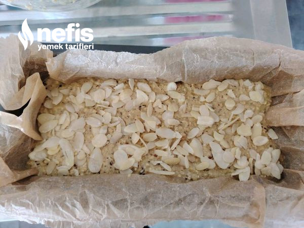 7. Bohcama yağlı kağıdı serip harcı döküp üzerine file bademleri koyup 190 derece evvelce ısıtılmış fırına sürüyoruz 45 dk boyunca.