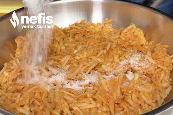 - Öncelikle elmaları rendeleyip içine yaklaşık bir çay bardağı kadar şeker ekliyoruz, akabinde tarçın ekleyip ocağa alıp suyunu çekene kadar kavuruyoruz.
