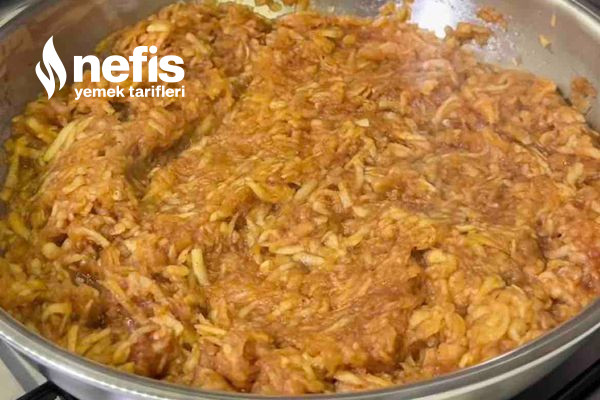 - Fırın tepsisine kavurduğumuz elmalı harcı seriyoruz güzelce.
