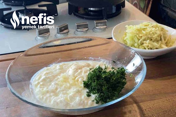 5. Uygun bir karıştırma kabına yoğurt, mayonez, sarımsak, kıyılmış dereotu ekleyip karıştıralarım.